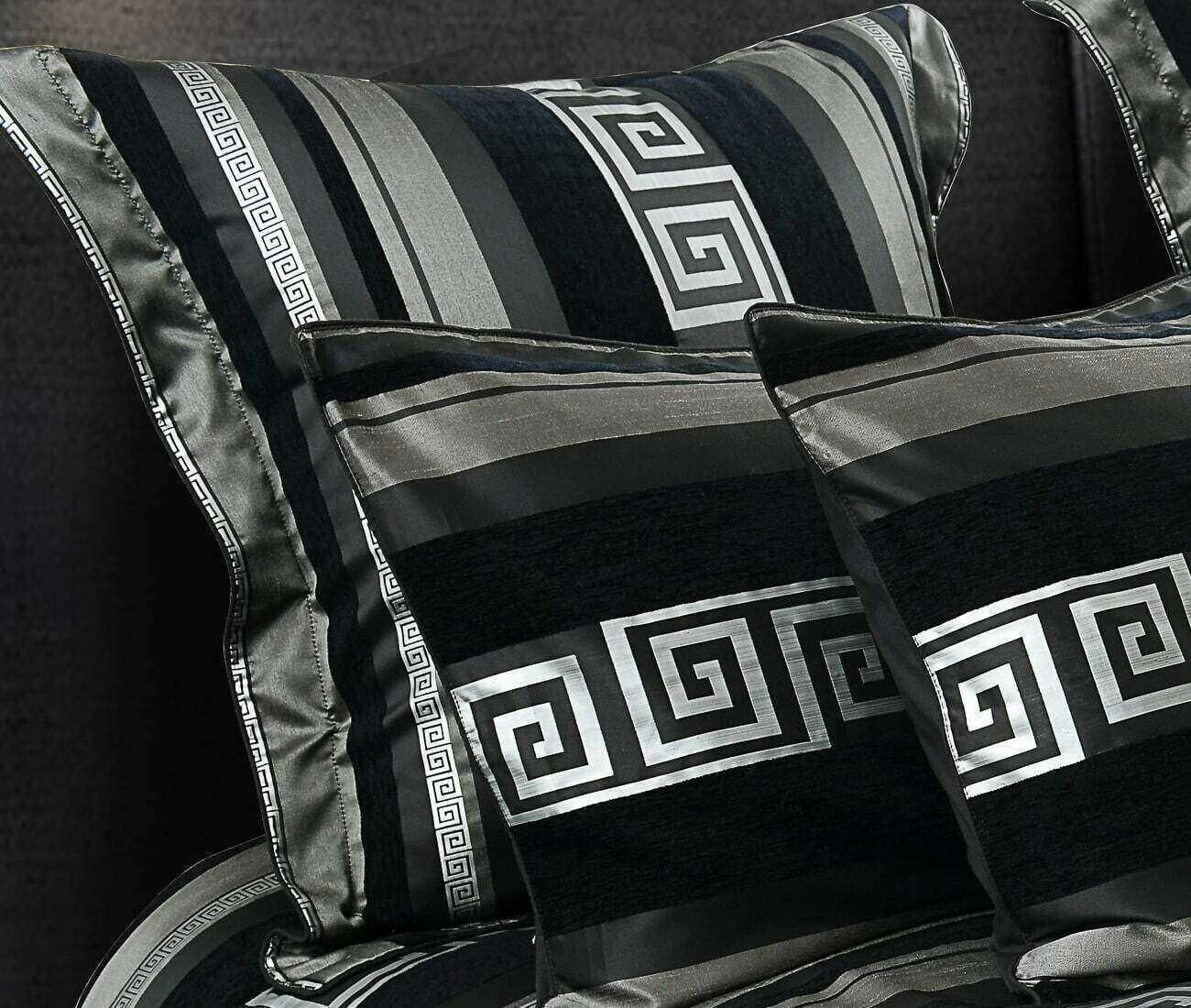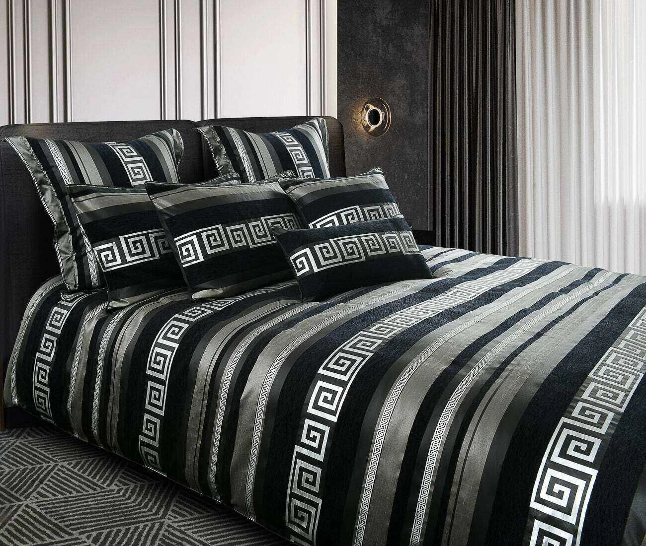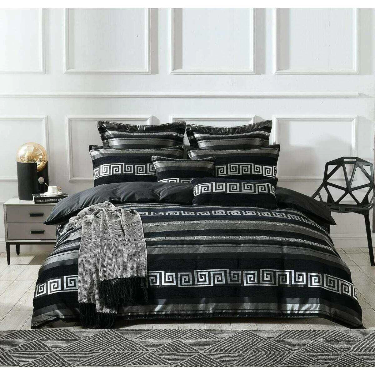 The Ambrose quilt cover set will make a beautiful statement in an contemporary home. This cover features a classic Greek Key style in a striking colour palette of Black, Grey and Silver.. This wonderfully soft cotton quilt cover can be beautifully complemented with a selection of cushions and throws. Included with the cover are 2 matching pillowcases.