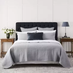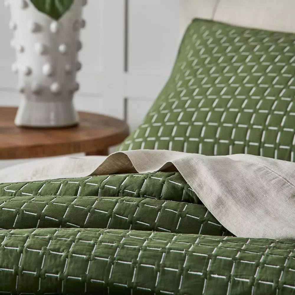 Arabella is a stylish cotton coverlet with a contemporary look. A white geometric pattern on dramatic green cotton is all the adornment needed for this stylish range.