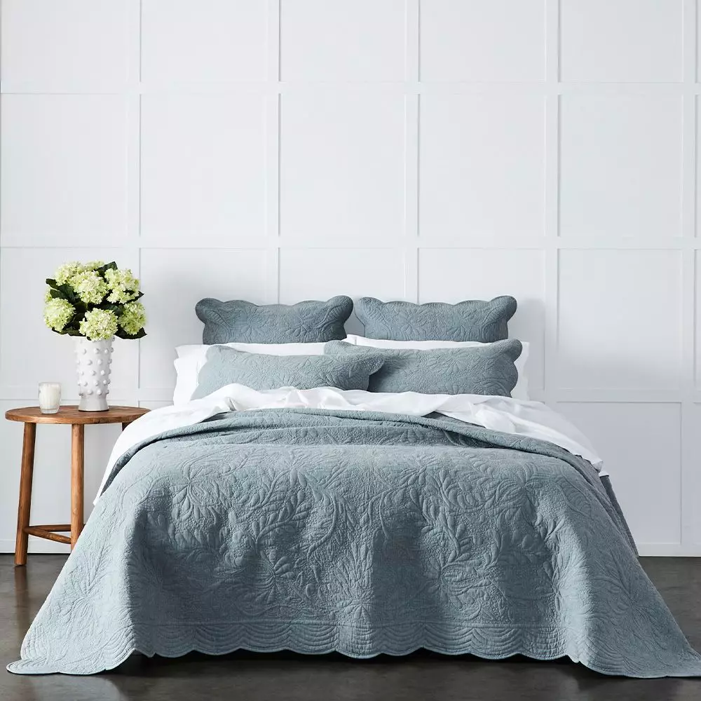 The Cullen is a beautifully stitched 100% cotton coverlet, quilted in the tradition French boutis manner with cotton filling between the two fabric layers. It is carefully stitched in a lovely floral pattern and finished with a pretty scalloped edge. The beautiful blue of the coverlet will give your bedroom a facelift and team with many other colours.