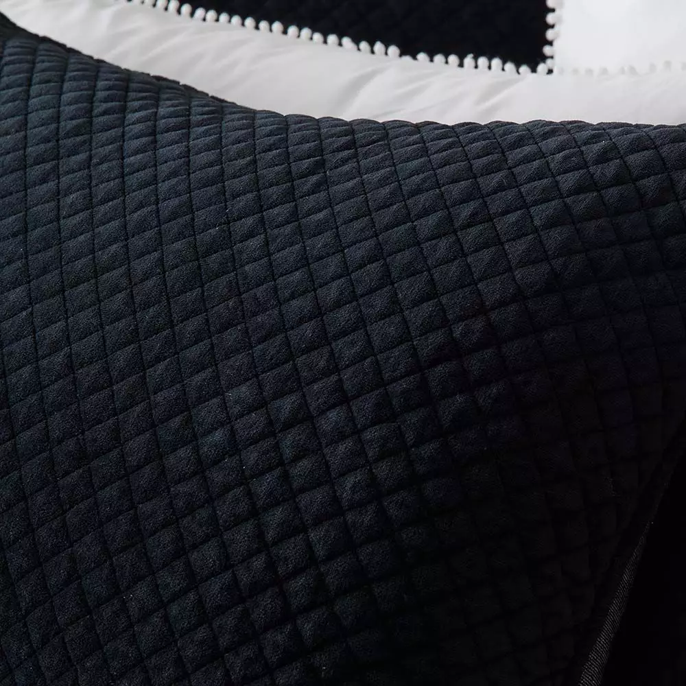 This luxurious black velvet coverlet is quilted in the traditional French boutis manner but is given a more modern look with diamond shaped embroidery and a black chambray fabric on the other side. The coverlet is reversible, so you have two looks from the same coverlet.