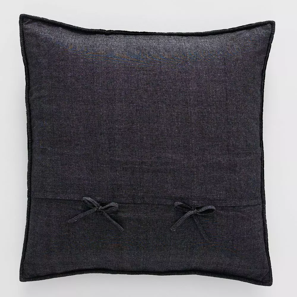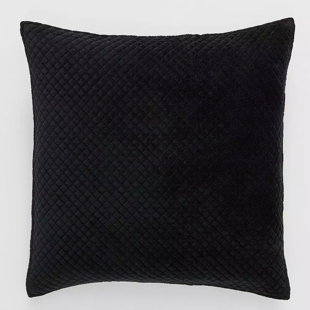 This luxurious black velvet sham is quilted in the traditional French boutis manner but is given a more modern look with diamond shaped embroidery. The reverse is a black chambray fabric which is closed with ties.